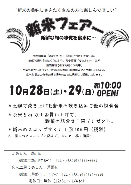 10月28日(土)・29日(日)新川店、芦野店、北郷店で