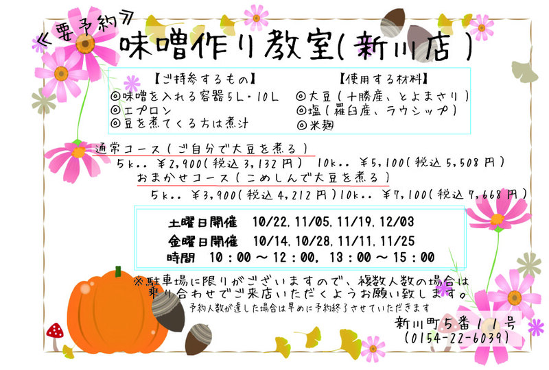 2022/10/01 2022年秋味噌教室 新川店日程が決まりました。