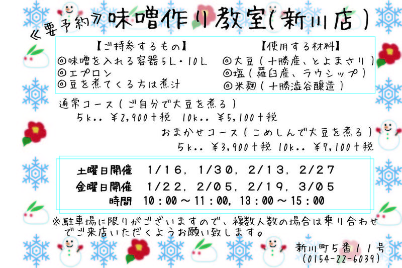 2020/11/14 2021年開催 味噌教室 新川店日程が決まりました。