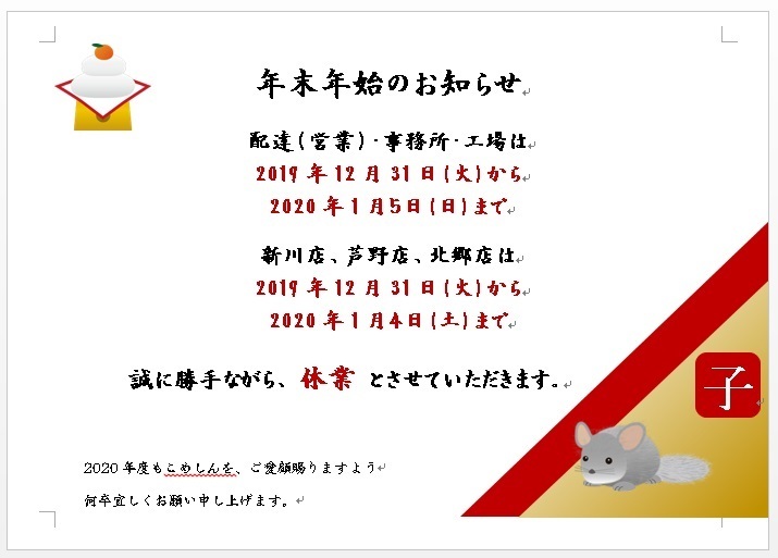 2019/12/21 年末年始の営業時間のご案内